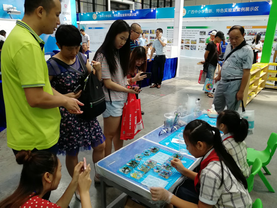 展會(huì)現(xiàn)場(chǎng)-工作人員給來(lái)訪人員介紹DIY學(xué)生實(shí)驗(yàn)制作解決方案產(chǎn)品及學(xué)生們展示DIY制作標(biāo)本