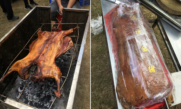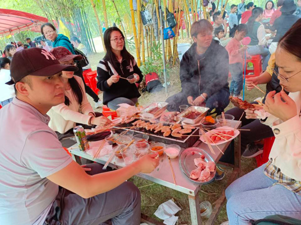 11:30體育運動結束后,大家來到燒烤場進行自助燒烤。燒烤場座落在綠蔭濃濃的竹林中,雖是冬日,卻煦日暖暖,溫和的陽光打在竹葉上,落下斑駁的日影,清風襲來,沁人心肺。燒烤場里飄香四溢的烤全羊、外酥里嫩的烤香豬、肥肥的雞腿、嫩嫩的雞翅、勁頭十足的牛肉丸,還有火腿、茄子、玉米、青椒等早已備好,此時大家早已饑腸轆轆,便迫不急待地動起手來,“自力更生”,喂飽自己的肚子! 大家團坐在烤爐旁,你遞個調(diào)料,我刷下辣醬,互幫互助,默契盡在不言中,其實,這也是一種心靈的溝通與交流。